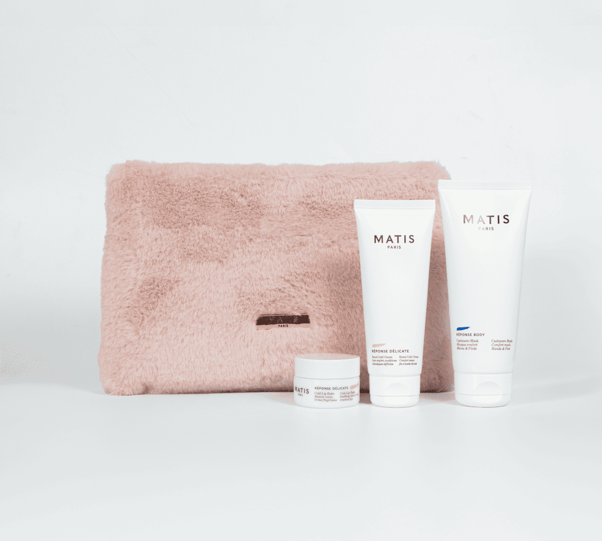 Trousse Délicate ma routine hivernale : 1 crème non grasse mais très hydratante spéciale vent de la côte et/ou montagne, une petite quantité suffit; matin et soir. 50ml (peut également s'utiliser en masque, pour la nuit en appliquant plus généreusement, ne pas rincer, laisser agir toute la nuit). 1 baume à lèvres non gras, réconfortant et réparateur, 8g OFFERT 1 crème/masque confort pour mains & pieds, 50ml OFFERTE 1 trousse doudoune rose poudré, pour le voyage, OFFERTE
